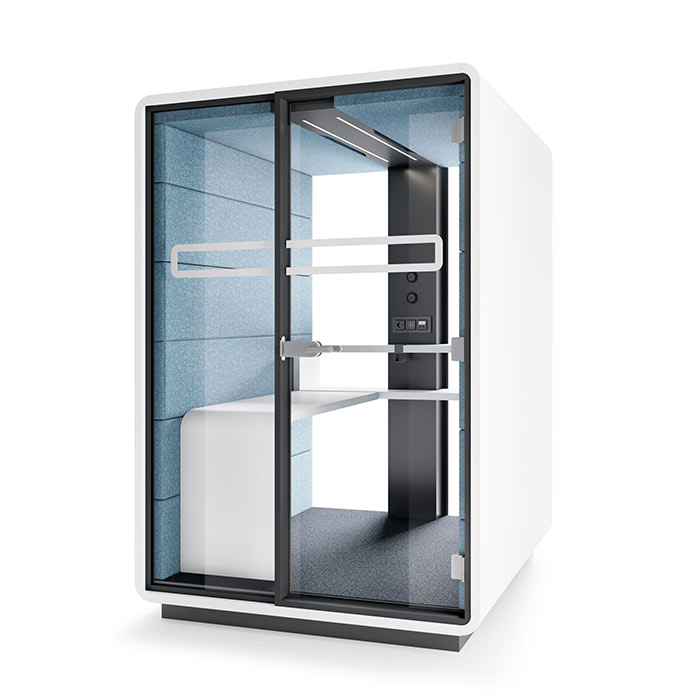 Hush Work is part of the Hush acoustic office pod range. The Hush pods are available in several different sizes including single user telephone pods, 2 to 4 user meeting pods & larger modular meeting room pods. All the Hush pods are easily moveable & Hush Work is no exception with a removable plinth that exposes pallet truck entry slots.