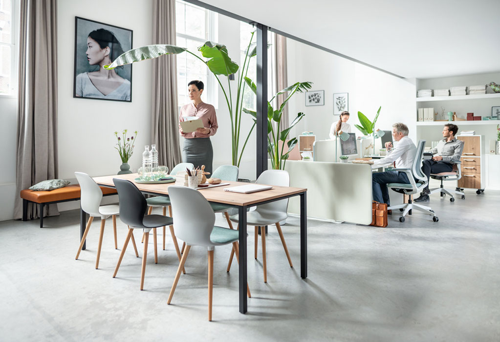 The Temptation Four table system is also available in a bench desk format which allows the structure to be shared. Bench desks require less floor space than individual modular desks & use less components. Temptation Four is also available as a team table which is a large square desk which only uses one desktop allowing grouped activities, eating or a space to work.